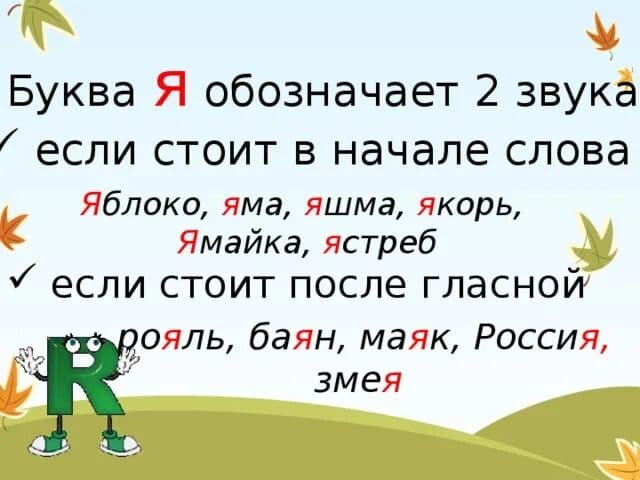В русском языке обычно графическое обозначение буквы соответствует определённому звуку речи. Учтём, что в некоторых словах полного соответствия букв и звуков нет. Например, буквы «е», «ё», «ю», «я» могут обозначать как один, так и два звука. Разберемся в этом, проанализировав местоположение буквы «я» в разных словах.