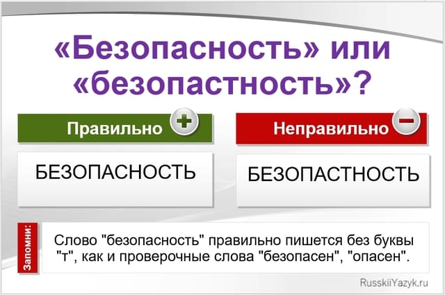 Проверочные слова «безопасен», «опасен» доказали, что слово «безопасность» пишется без буквы «т».